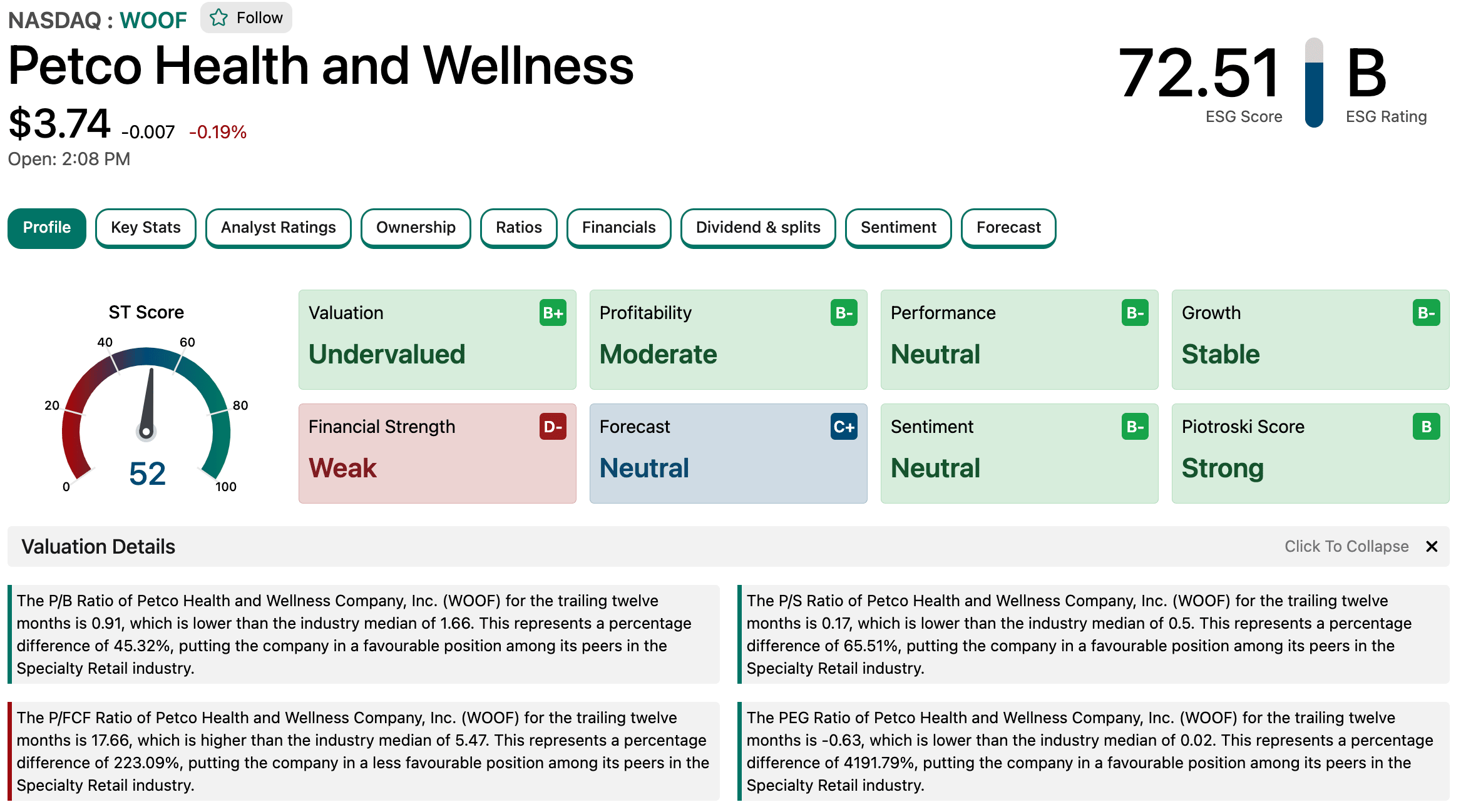 Petco's stock is currently trading at a low valuation multiple (e.g., Price-to-Sales, Price-to-Book) typical of a deep-value turnaround or a retailer facing headwinds.