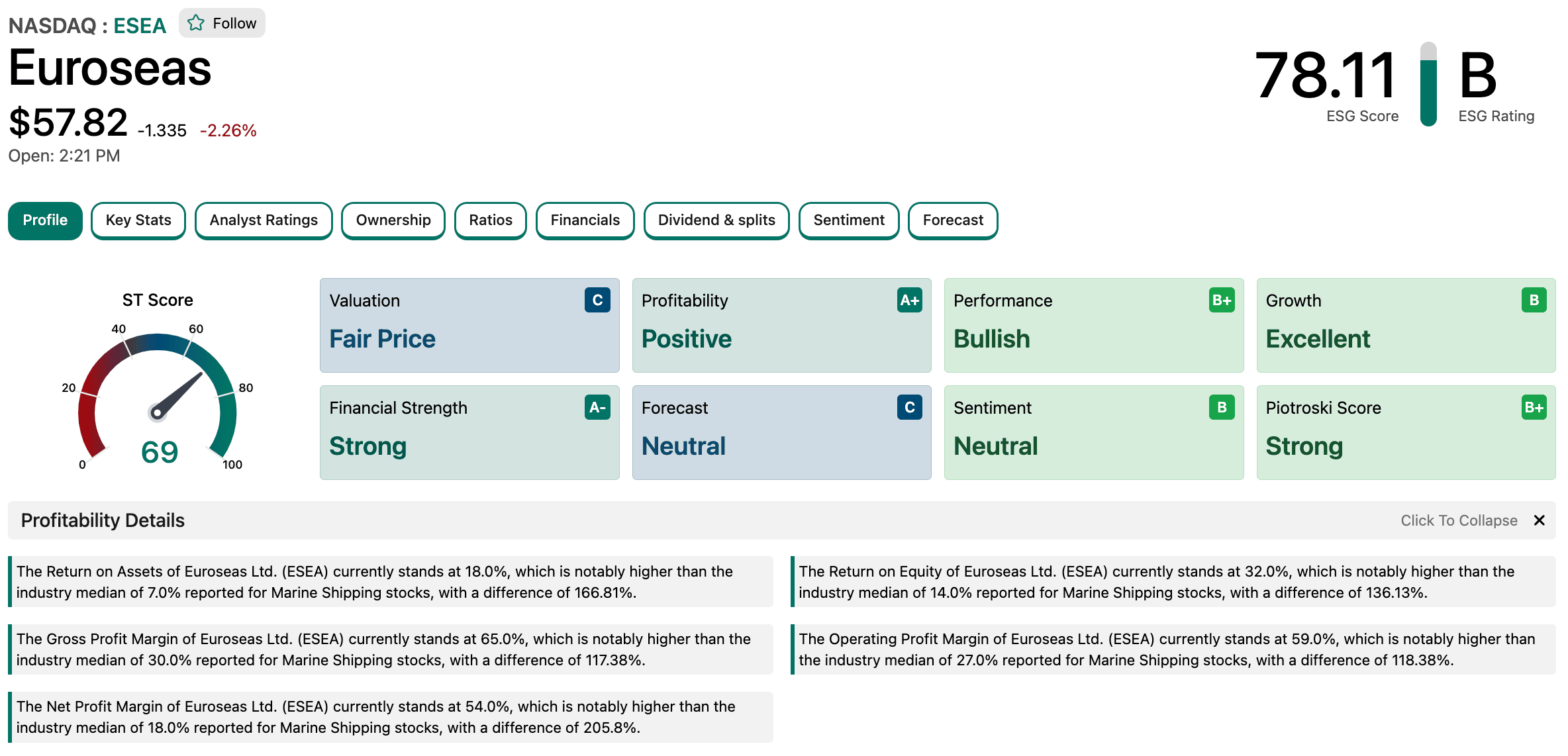 - Profitability Score: ESEA has an exceptional profitability score, driven by a Gross Margin of over 74% and a Net Profit Margin nearing 54% (TTM).